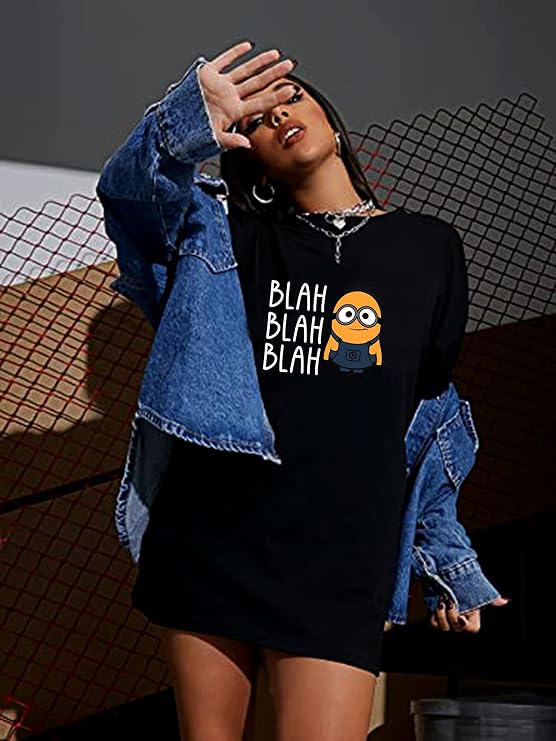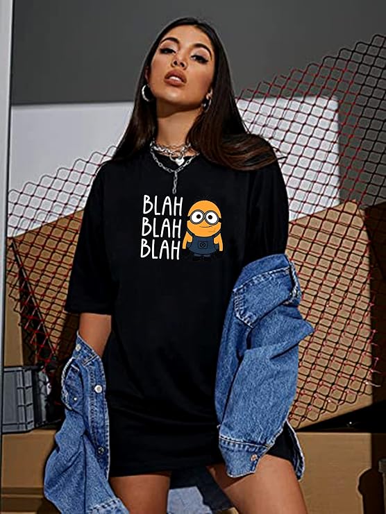 MiraTees Women's Pure Cotton Oversized Black T-Shirt, Casual Printed Baggy Round Neck, S-XL